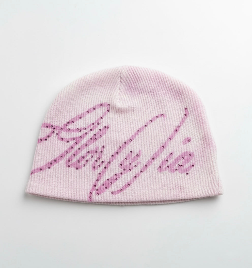 GLOR(y)IA BEANIE IS CONSTRUCTED FROM WAFFLE THERMAL MATERIAL WITH A CYANO TYPE PRINTED DESIGN AND FUCHSIA PRECIOSA CRYSTALS